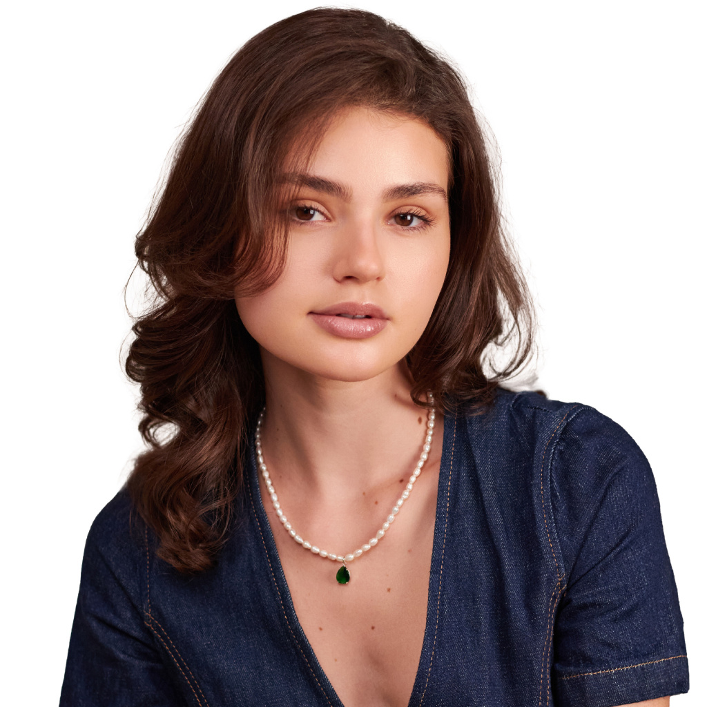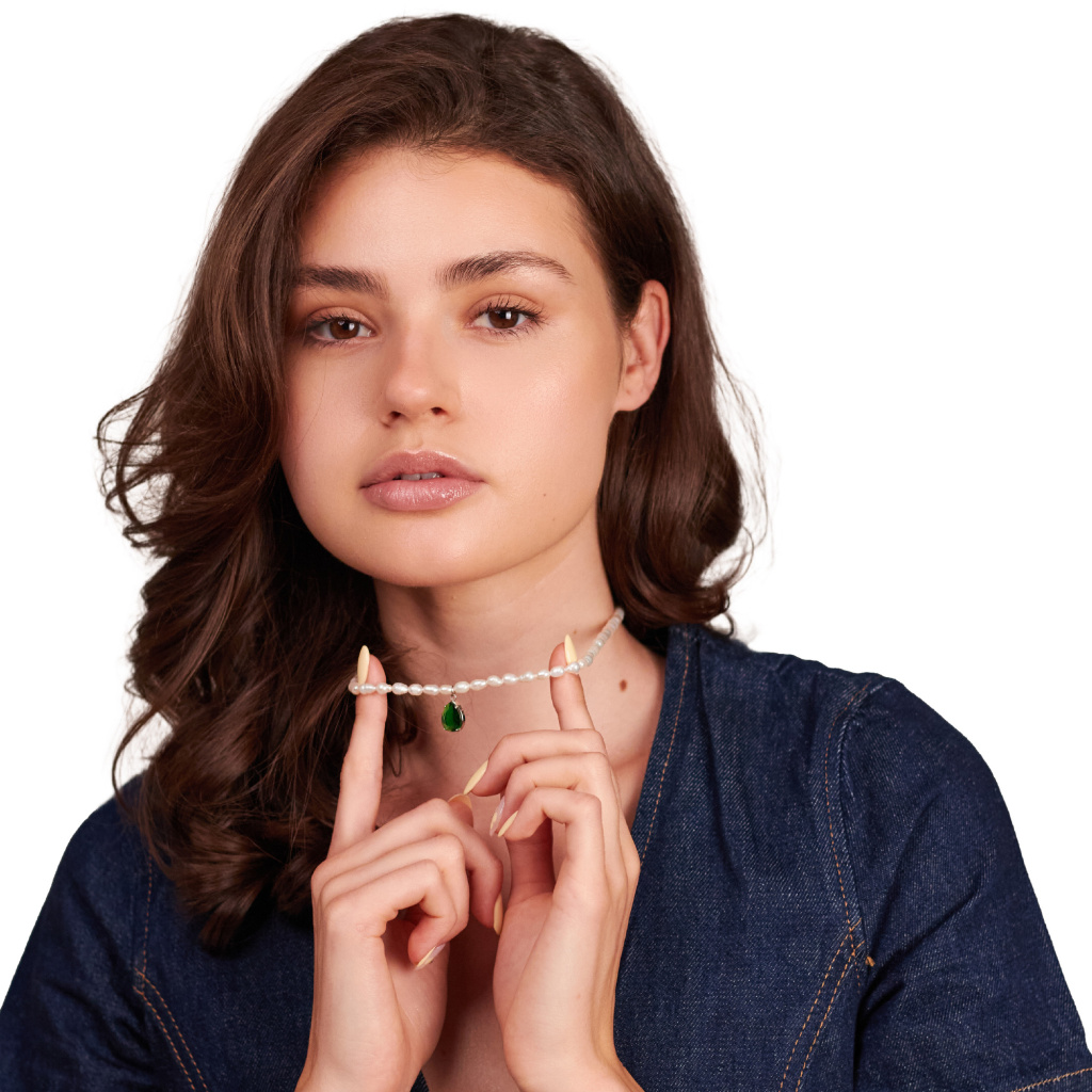 Perličkový náhrdelník s přívěskem zeleného kamene - stříbrný